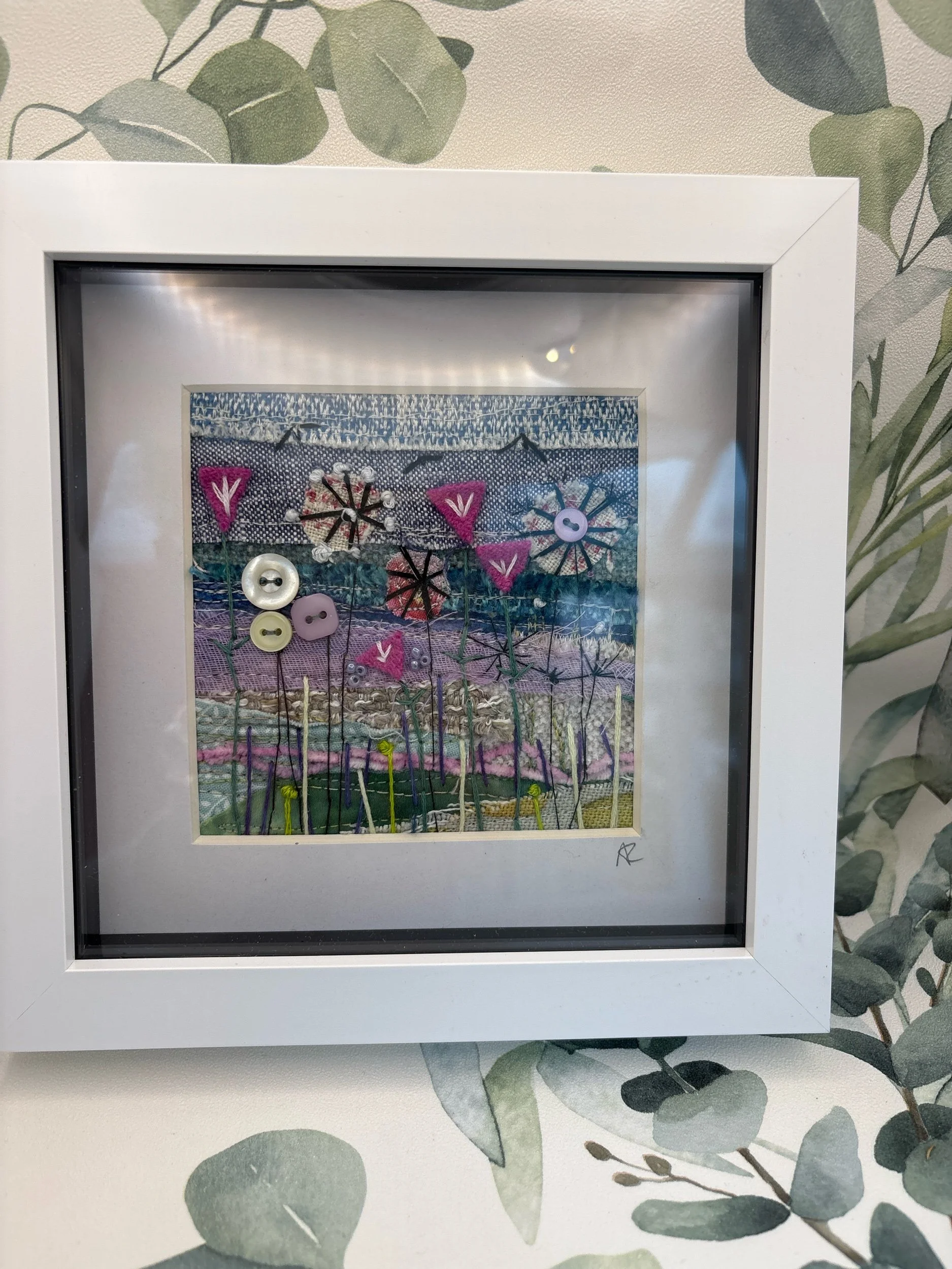 Unique one of a kind textile piece created with Freestyle Machine Embroidery background and finished with buttons, beads and hand sewing!
