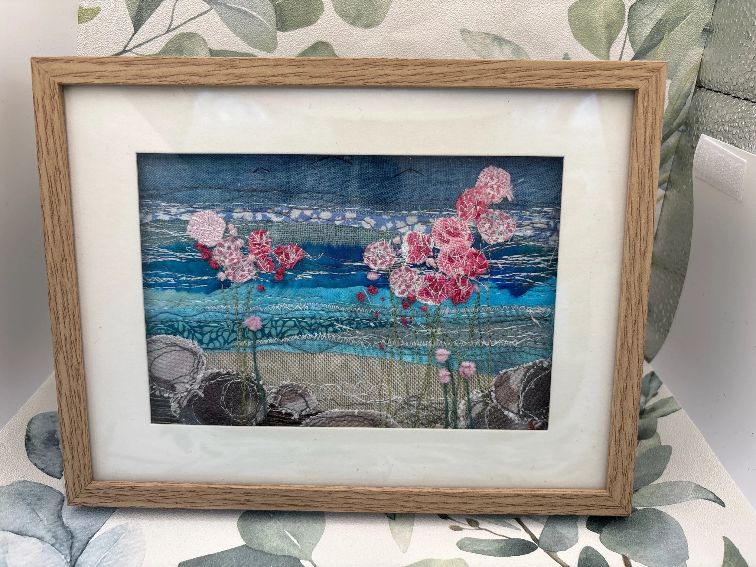 Inspired by Cornish Seas and Thrift! Freestyle Machine Embroidery created by drawing free motion with the sewing machine and finished with some hand sewing